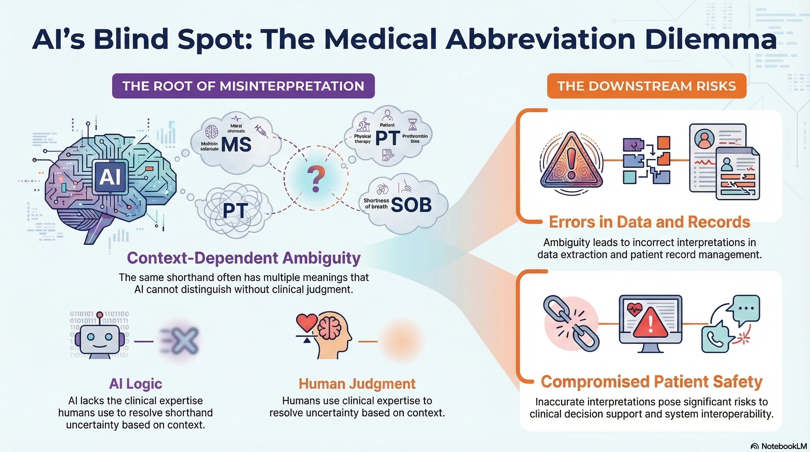 Importantly, this challenge is not limited to human readers. As healthcare becomes increasingly digital, AI systems also face similar difficulties when interpreting unclear or inconsistent abbreviations.