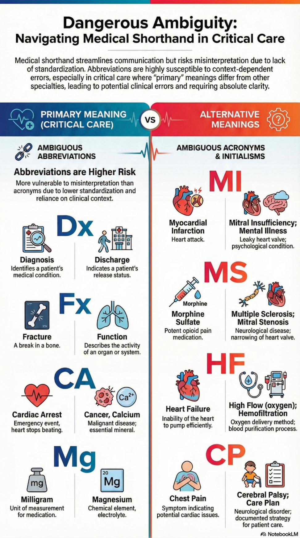 Ambiguity in medical abbreviations related to drug dosage or administration often translates into real-world clinical errors. Common error-prone medical abbreviations include: