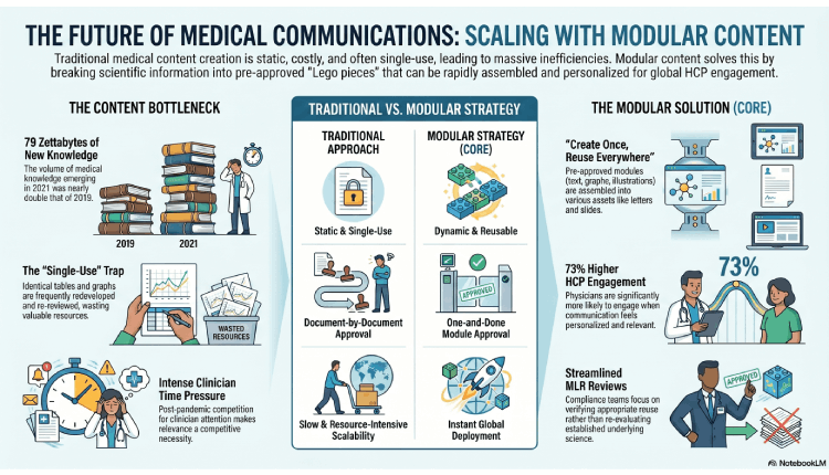 The time pressure on clinicians has intensified since the COVID-19 pandemic, and the competition for their limited attention has also grown sharply 1. At the same time, the volume of medical knowledge being published is expanding at a staggering rate. An Elsevier survey of 1778 physicians found that 79 zettabytes of new medical knowledge emerged in 2021—almost twice the 2019 volume1. In this environment, the Medical Affairs teams can no longer sustain creating unique content for every channel, region, and audience.  The industry’s answer is modular content—pre-approved, reusable blocks of scientific information assembled, adapted, and deployed at scale. Done well, modular content drives efficiency, global scalability, and true omnichannel HCP engagement.